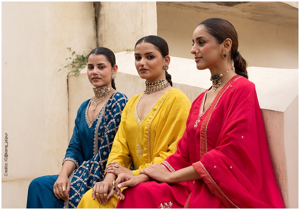 Karaj Jaipur’s collections are poetic narratives, each with a unique theme and emotional resonance. They are a testament to the brand’s creative range, moving seamlessly from vibrant celebrations to quiet elegance.